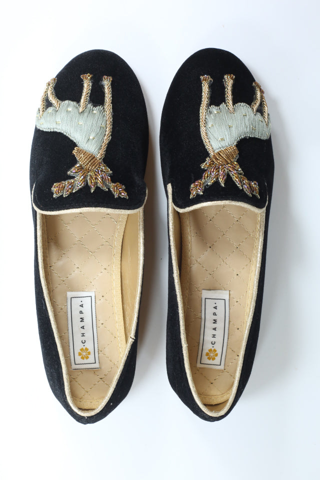 Black Pointed Toe with Hand Embroidered Gold Parinda Slip-ons