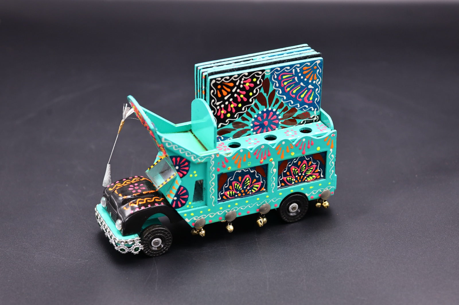 Bring a touch of whimsy to your tea time with the Firozi Coaster Truck. This charming truck-shaped holder, crafted from wood, features a vibrant turquoise finish. Its four compartments provide ample space for your coasters, keeping them organized and adding a delightful pop of color to your table.
